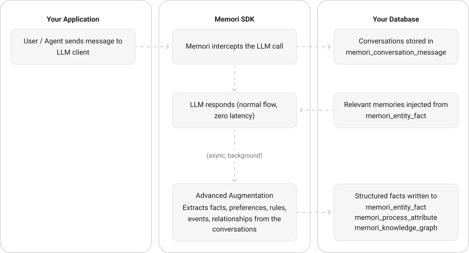 Augmentation — After a conversation completes, Memori processes it asynchronously — extracts facts, generates embeddings locally, and builds knowledge graph triples.