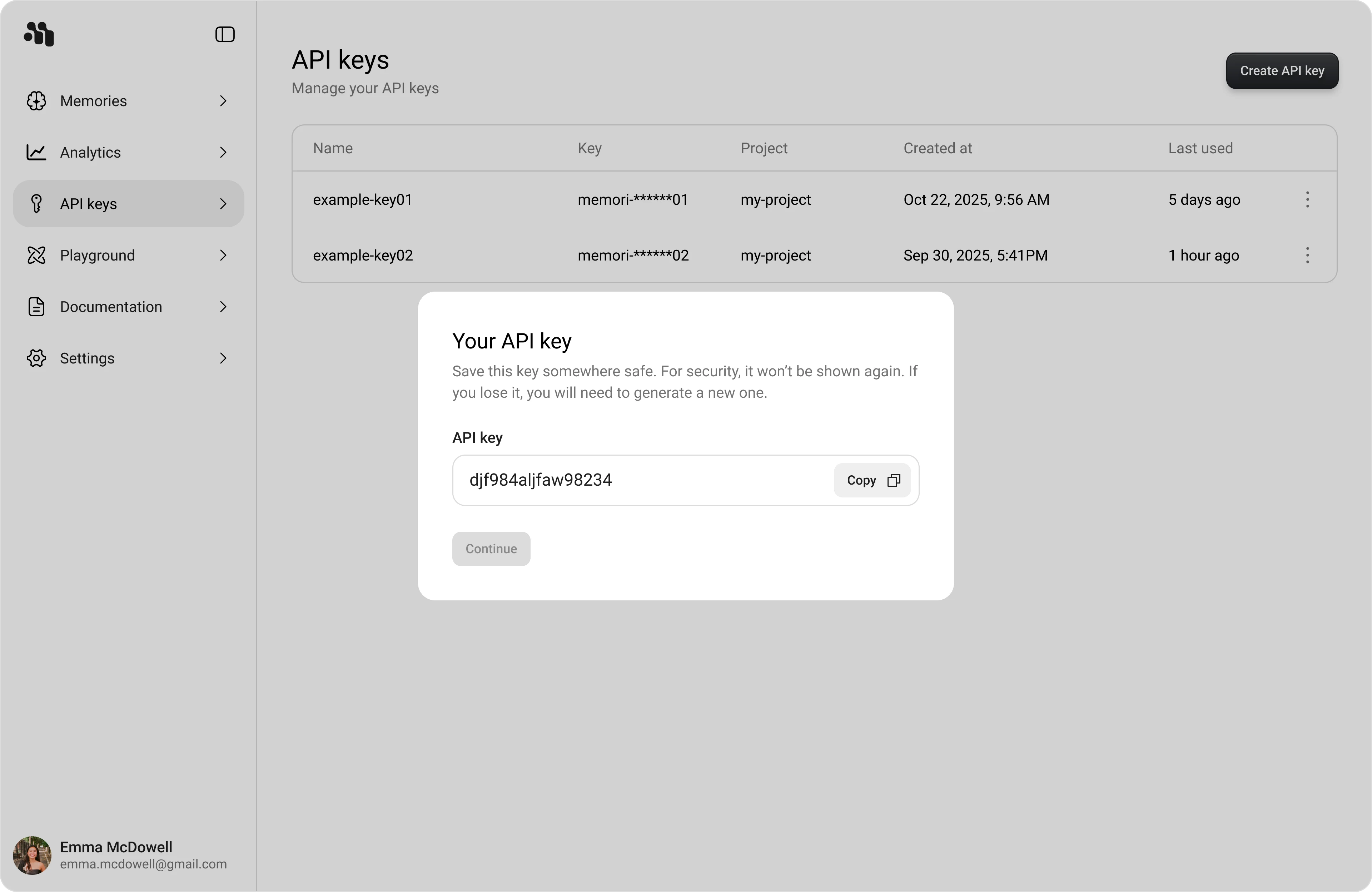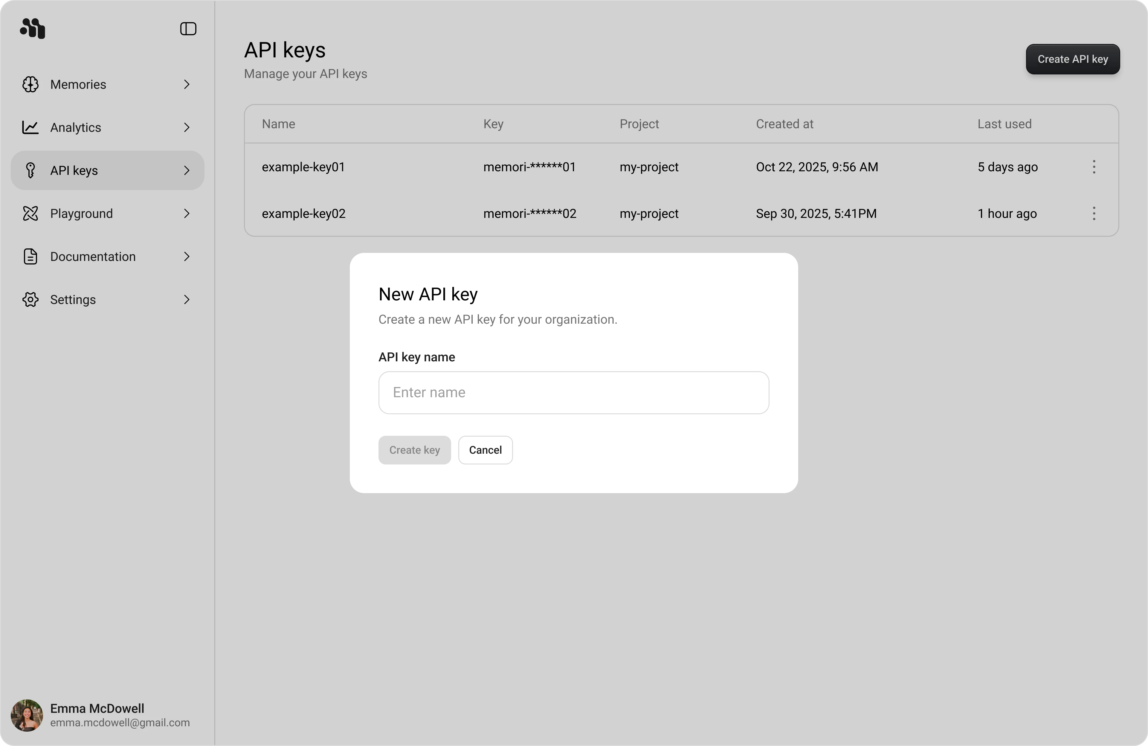 Use the API keys page in app.memorilabs.ai to create and manage keys for your organization.