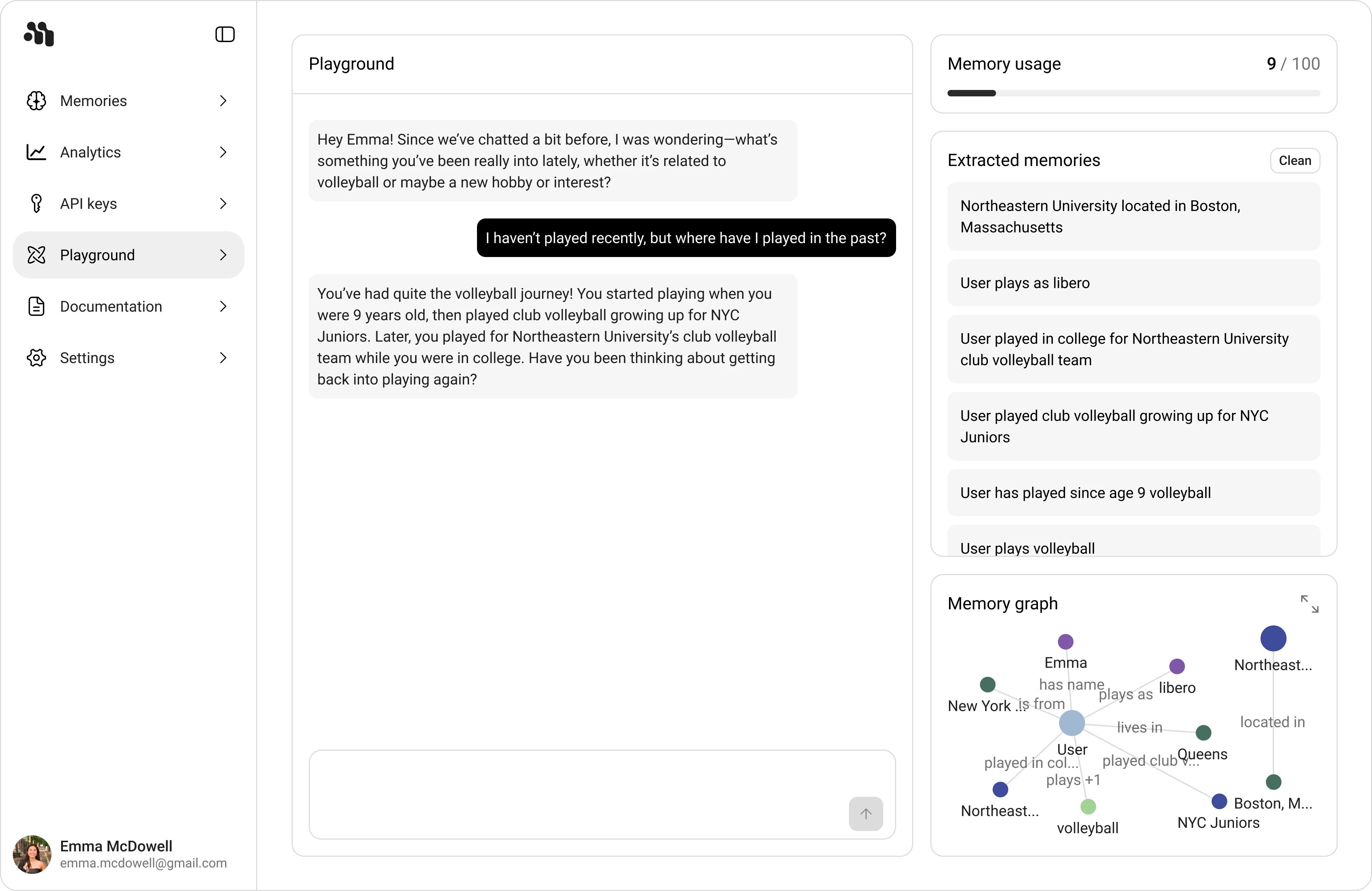 - Left navigation: Memories, API keys, Playground, Documentation, Settings