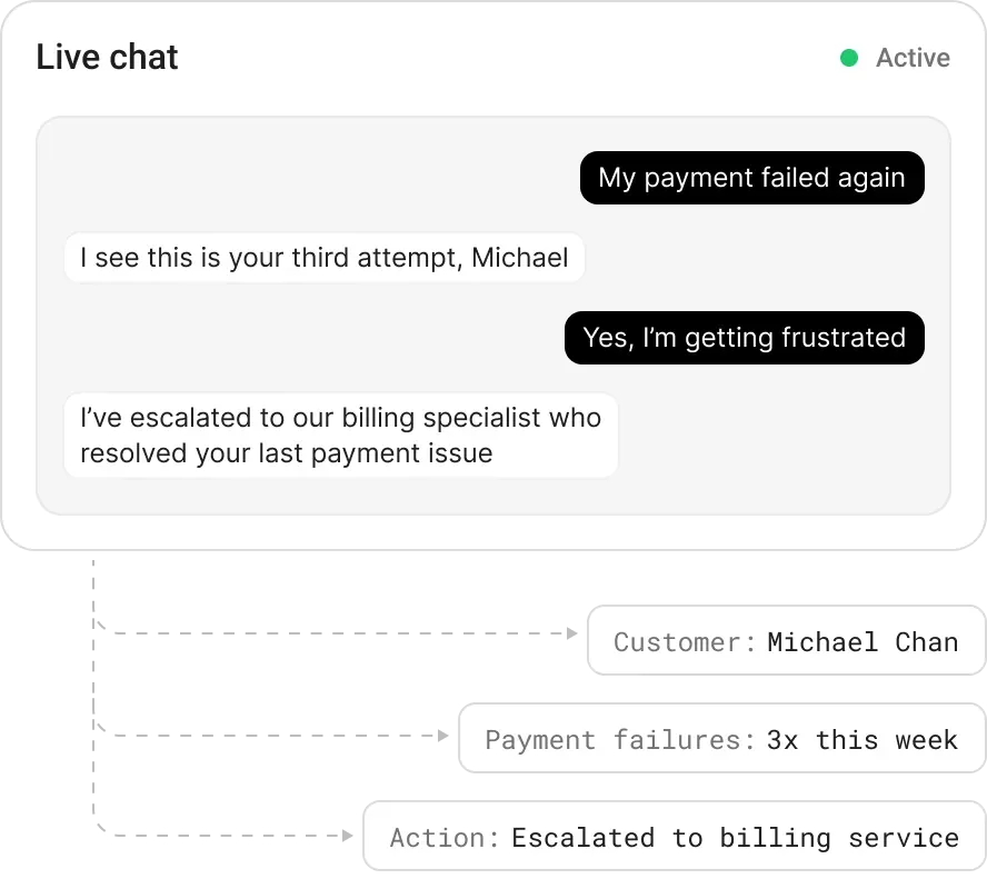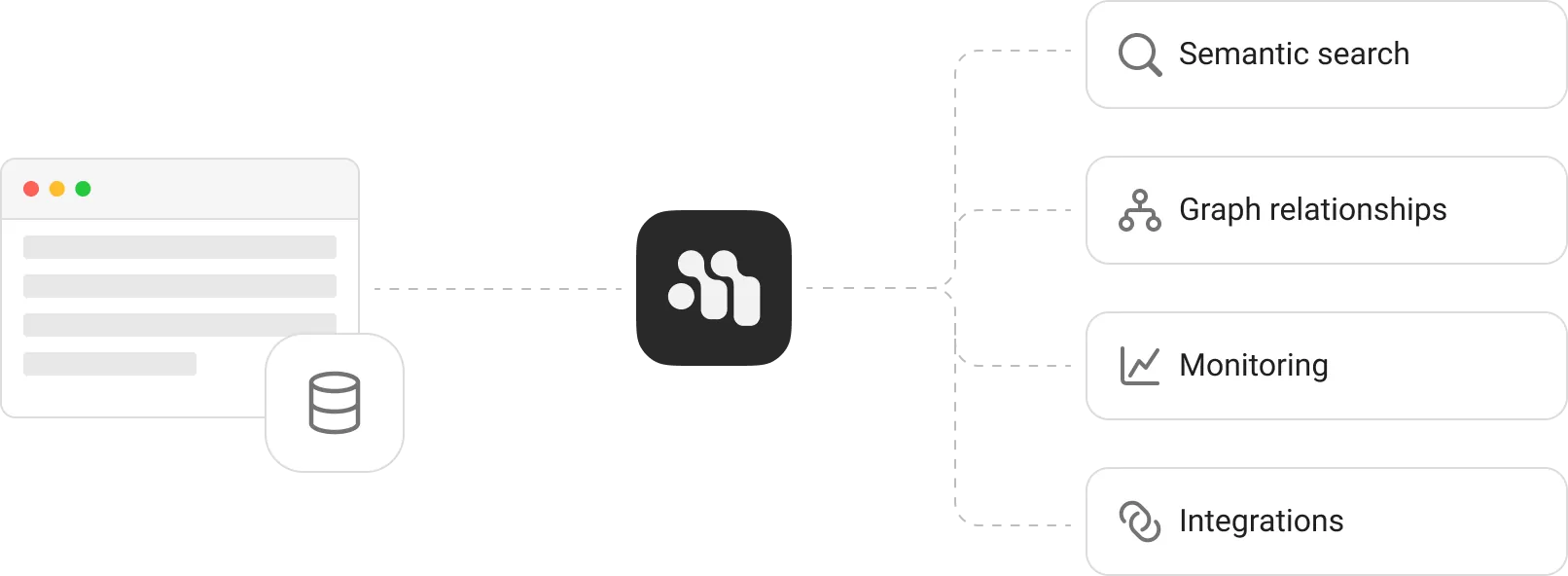 Store memory in your database, then layer on our secure hosted capabilities for semantic search, graph relationships, monitoring, and third-party integrations for bi-directional enrichment.